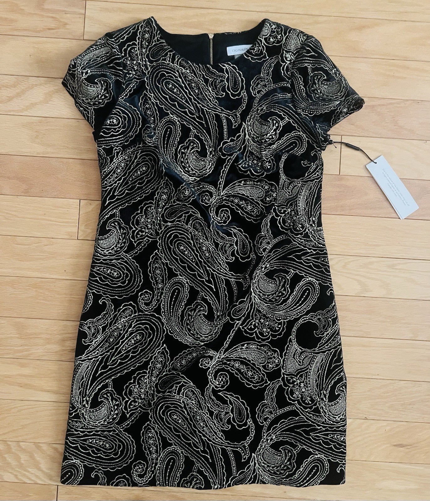 NWT Womens Calvin Klein Short Sleeve Velvet Embroidered Dress Black Gold 8