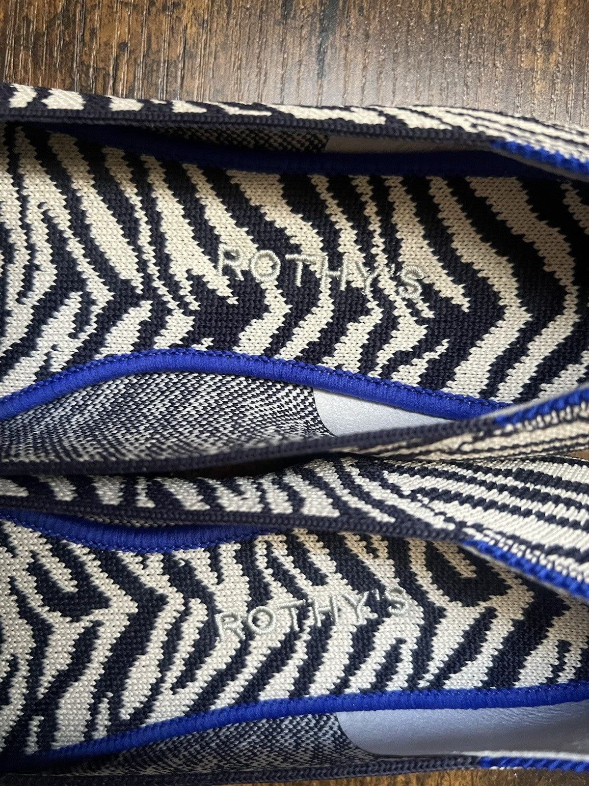 These stylish Rothy’s loafers feature a bold zebra print knit with cobalt blue trim and a red heel stripe accent. Comfortable, versatile, and eco-friendly, Rothy’s shoes are made from recycled materials and are fully machine washable.