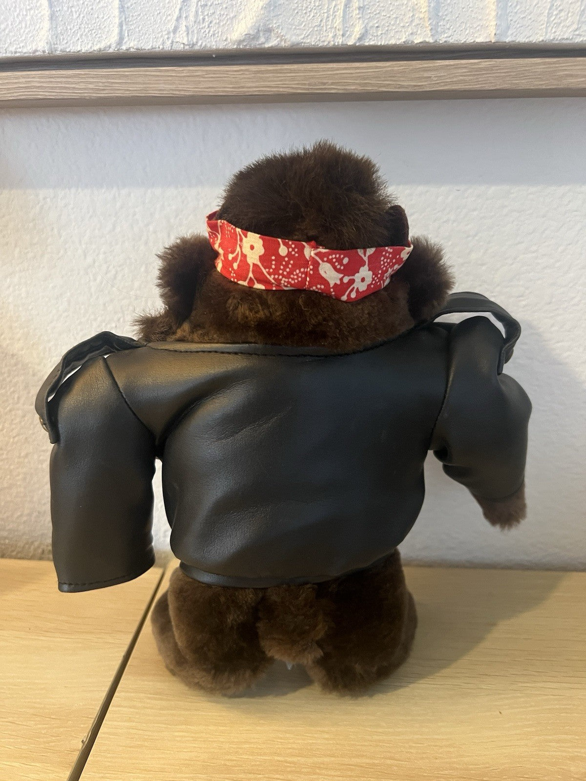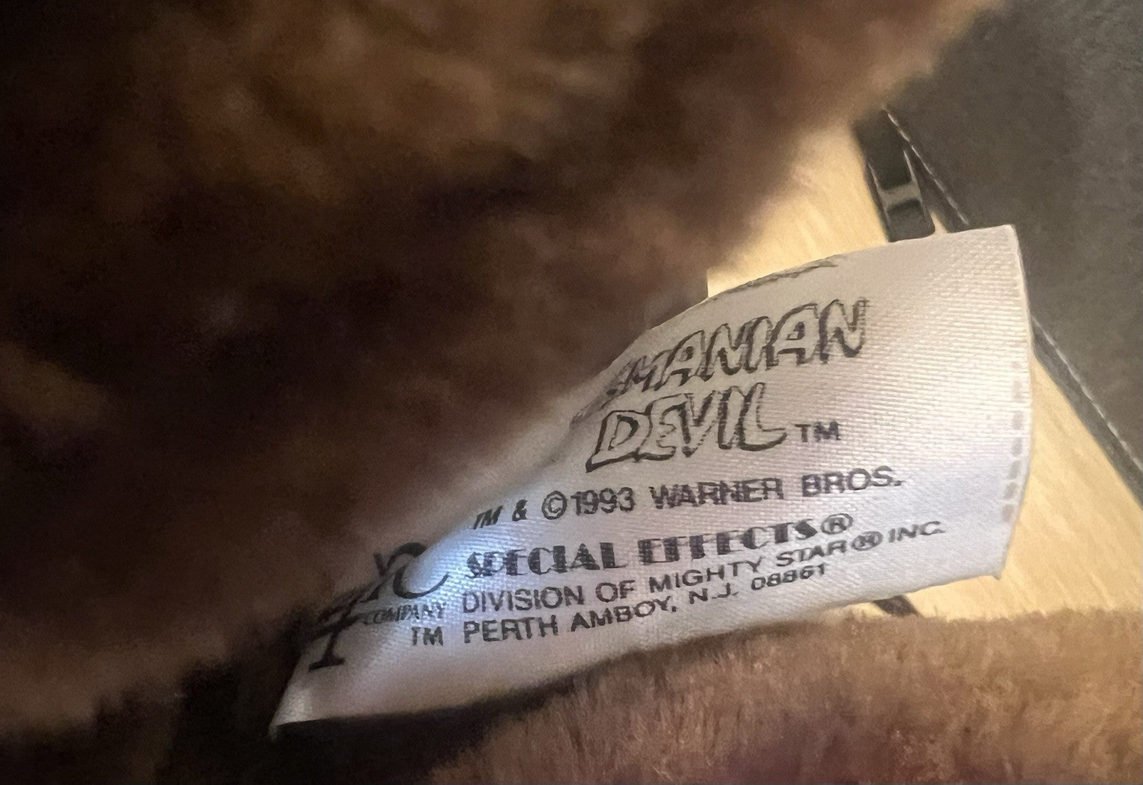 This vintage 1993 Tasmanian Devil (Taz) plush features the beloved Looney Tunes character dressed in a black faux leather biker jacket and red bandana. Produced by Special Effects, a Division of Mighty Star Inc., this officially licensed Warner Bros. plush is a fun and rare find for fans and collectors alike.